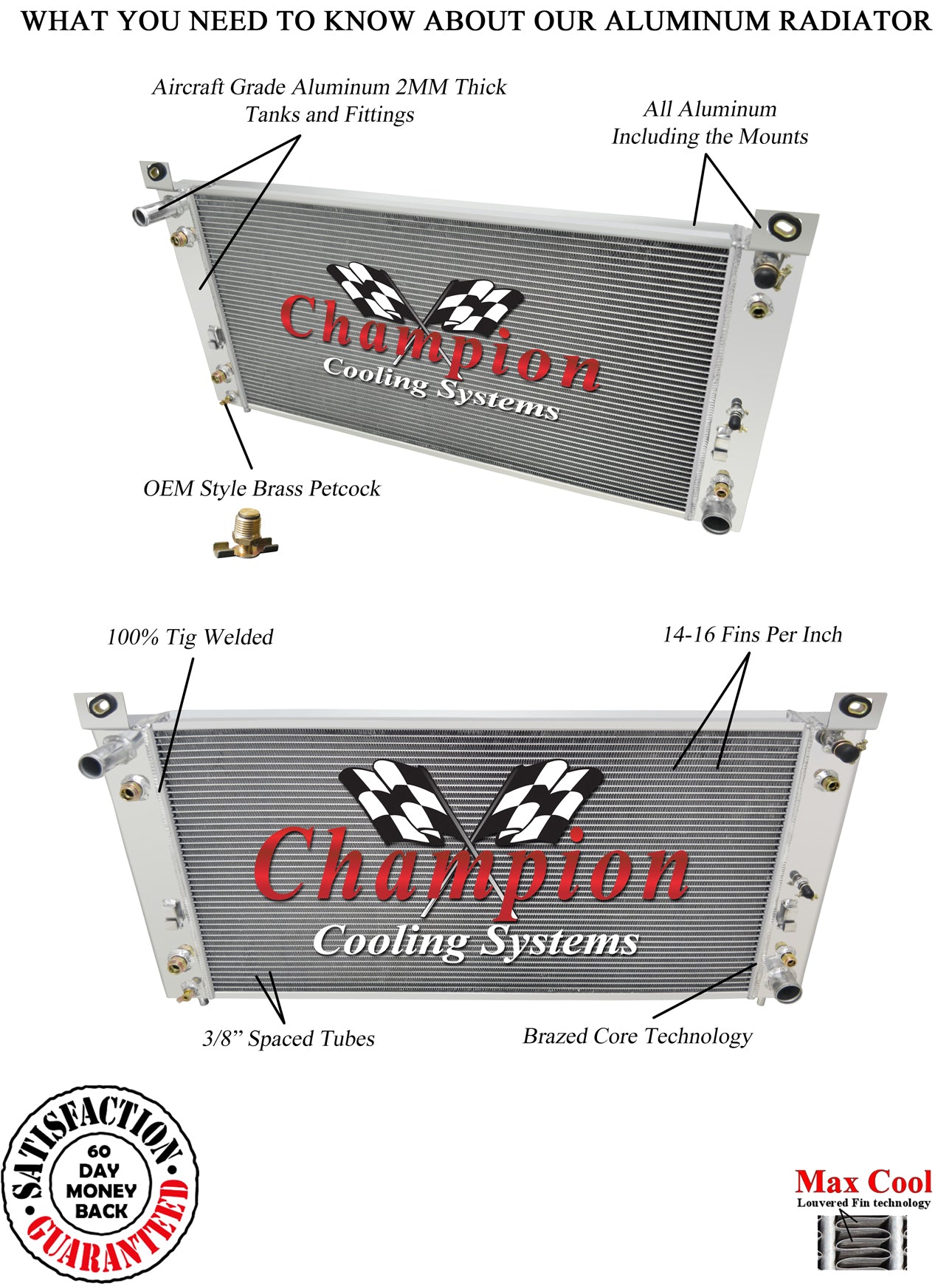 " Down Flow Or Cross Flow Type: Cross Flow | Core Height: 17.25 | Core Width: 34 | Overall Height: 21.375 | Overall Width: 40.5 | Core Thickness: 2.25 | Core Row Quantity: 3 Row | Mounting Type: Bracket & Pin | Inlet Location: Driver | Inlet Diameter: 1.3125 | Outlet Location: Passenger | Outlet Diameter: 1.5625 | Internal Transmission Oil Cooler: Yes | Transmission Oil Cooler Fitting Type: 5/8-18 Straight Thread, Inverted Flare | Tank Material: Aluminum | Core Material: Aluminum | Filler Neck Attached: No | Core Tube Width: 0.63"