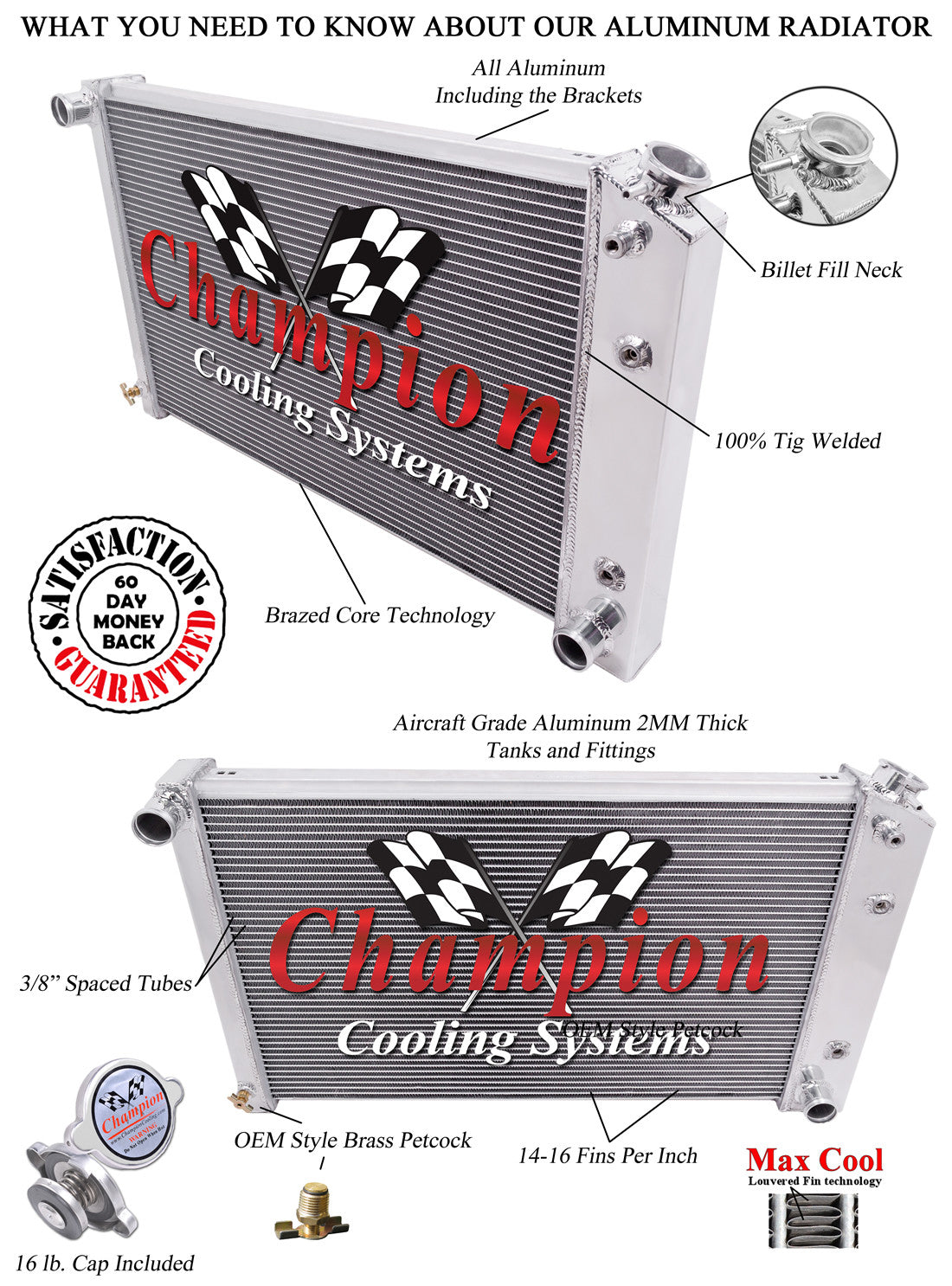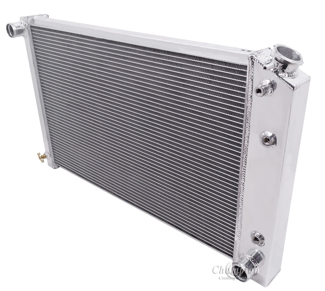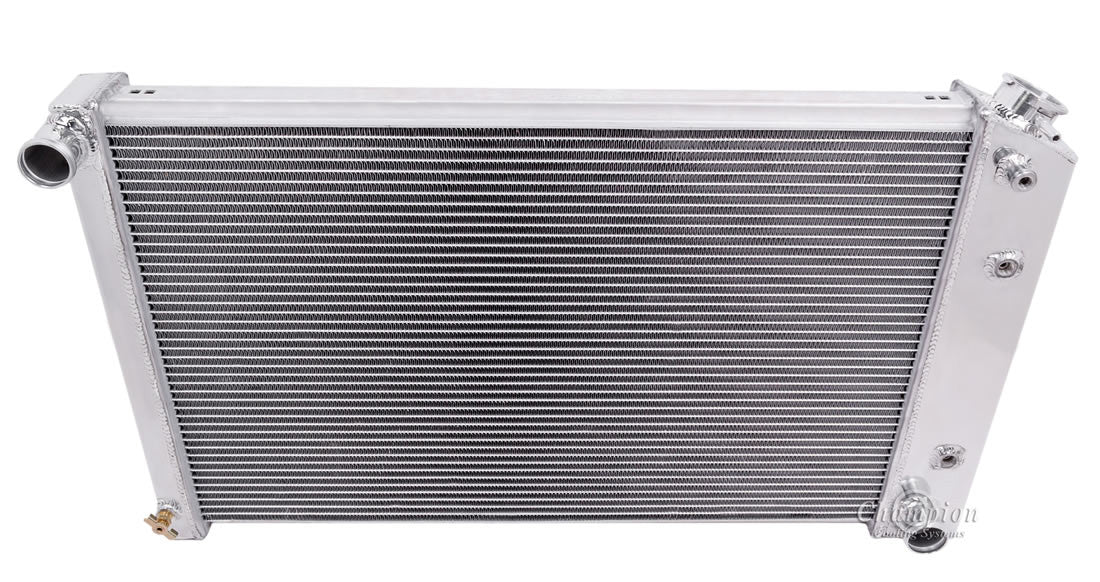 RADIATOR FLOW: CROSS FLOW |CORE DIM (H x W): 17 x 26 1/4 |OVERALL (H x W): 18 1/2 x 31 |HOSE LOCATIONS: IN: Driver / OUT: Passenger |HOSE FITTINGS: IN: 1 1/2 - OUT: 1 1/2 |TRANS COOLER: 1/2-20 Straight Thread; G 1/4 |MOUNTING TYPE: SADDLE MOUNT